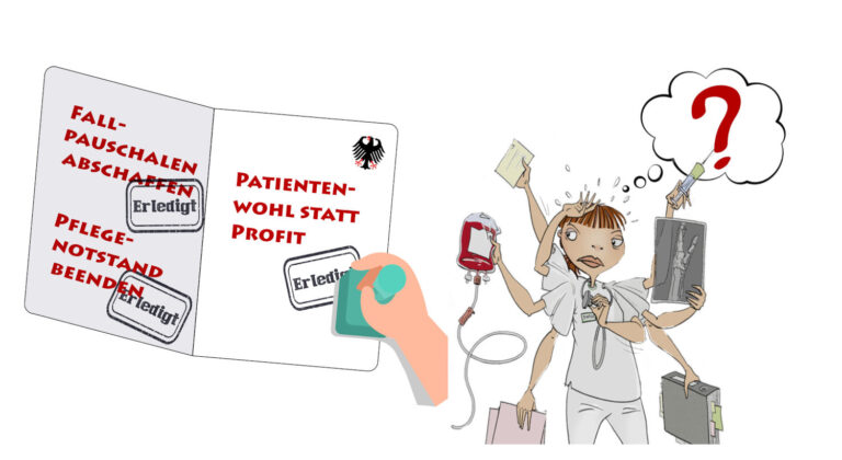Die Pläne dazu werden nicht öffentlich diskutiert, sondern hinter ver­schlos­senen Türen ausgearbeitet. Sicher ist: ihre Umsetzung hätte massi­ve Aus­wir­kungen auf Beschäftigte und Patient*innen.