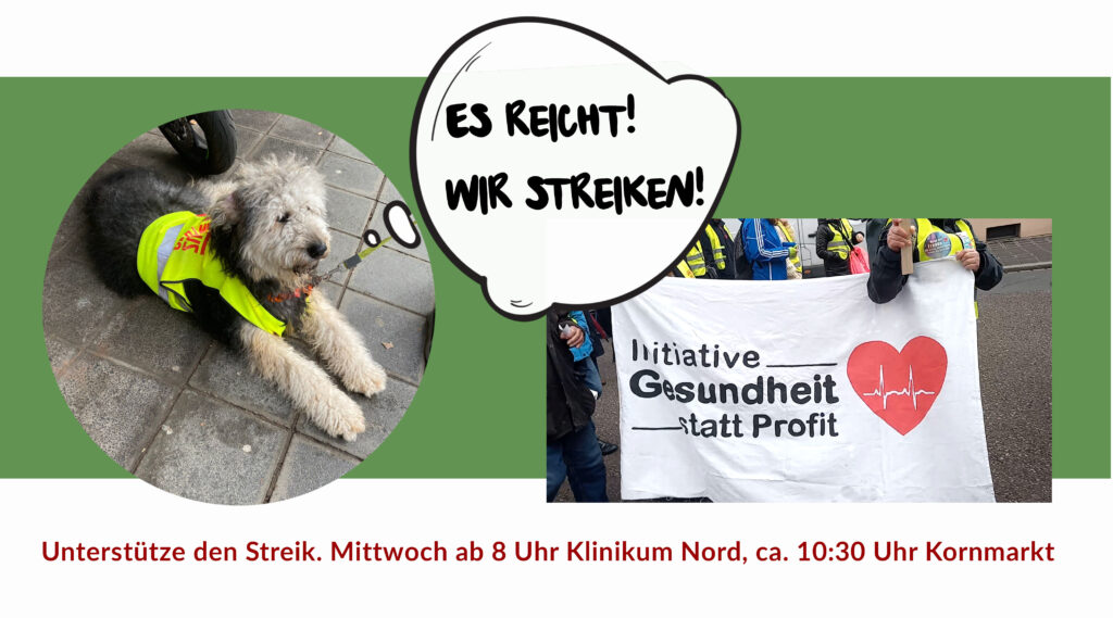 Unterstütze den Streik im öffentlichen Dienst. Komm am Mittwoch, 22. März um 8 Uhr zum Klinikum Nord oder um 10:30 Uhr zur Kundgebung am Kornmarkt. Es geht um die Frage: Sollen die Lohnabhängigen die Folgen der Krise tragen und Reallohnverluste hinnehmen müssen? Oder kann ein starker Streik die Latte hoch genug legen und mindestens einen Inflationsausgleich erreichen?