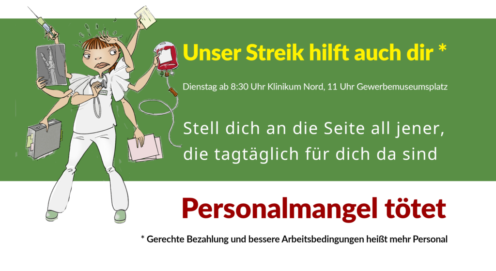 Ihr seid eingeladen: Unterstützt den Warnstreik im Gesundheitswesen in #Nürnberg am 14.03.23 – Unser Streik hilft auch euch. Denn Personalmangel im Gesundheitswesen tötet. Kommt zwischen 8:30 und 10 Uhr zum Klinikum Nord oder um 11 Uhr zum Gesundheitsministerium am Gewerbemuseumsplatz. Kämpft mit uns für ein stabiles Gesundheitswesen und gerechte Löhne vor allem für Geringbeschäftigte. Stellt euch an die Seite all jener, die tagtäglich für euch da sind.
