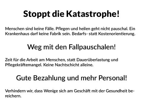 Ein Krankenhaus darf keine Fabrik sein. Wir fordern gute Arbeitsbedingungen für die Pflegenden und ausreichend Personal. Pflege, Therapie und Behandlung darf nicht den Profitinteressen Weniger untergeordnet werden. Für kostenlose Versorgung und die Vergesellschaftung des Gesundheitssystems. Wann ist der Zeitpunkt besser, dies durchzusetzen, als jetzt.